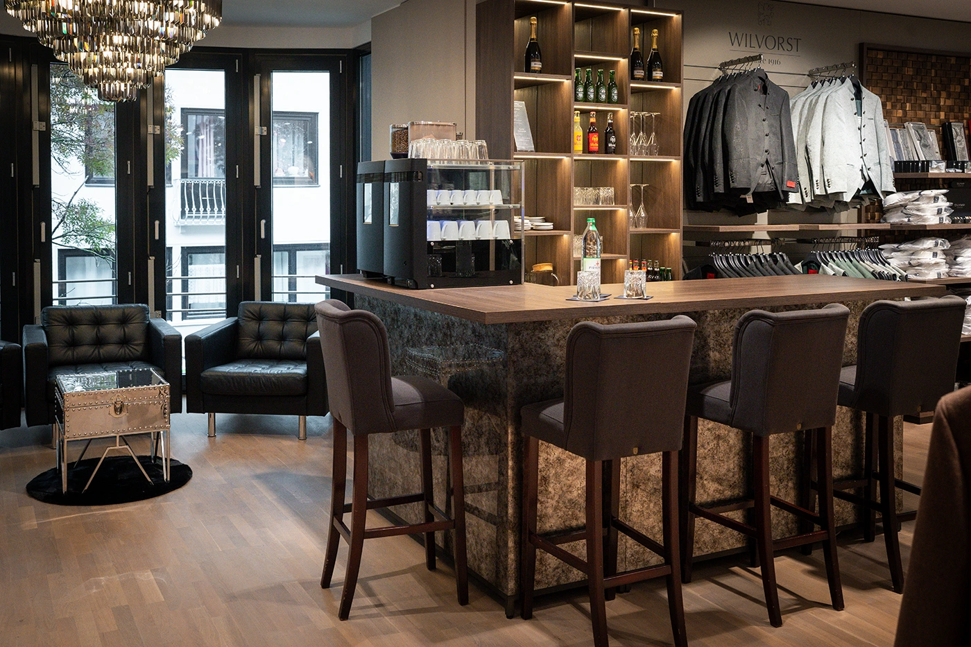 Ein Espresso, ein Wasser, einmal durchatmen. Die Kaffeebar ist Treffpunkt für Begleitung und ein ruhiger Moment zwischen zwei Anproben.